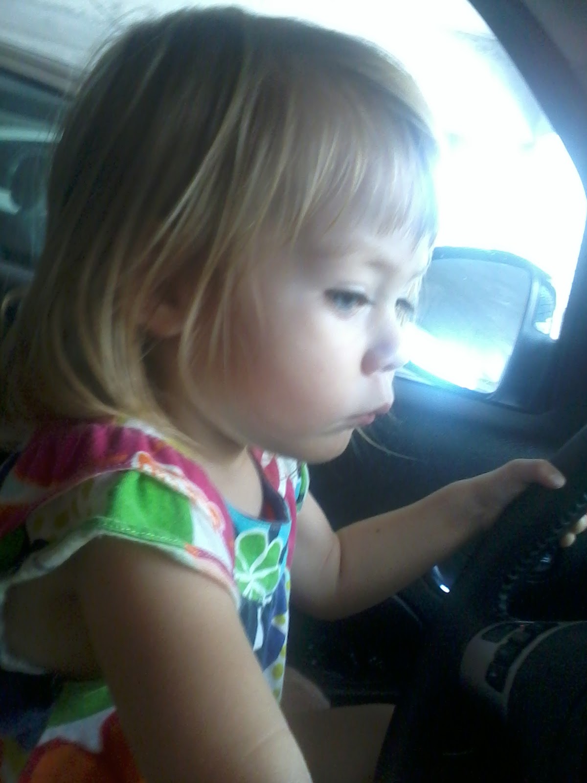 We came back to earth later when we left the museum. She announced 'NO CARSEAT!' at the top of her lungs and her tiny body went rigid. The top of her head went hot and moist as it does when she's about to loose her temper. I went ahead and lost mine first. I slammed her door, huffed into the driver's seat and announced 'Mama is VERY angry right now.' Productive. She putzed around the back seat for a while as I fumed, returned texts and ignored her. Then she crawled into the front seat, gave me her under-the-lashes grin and said 'Uth push buttons' as she proceeded to touch every button on my console. I felt a wave of irritation begin to crest. It receded abruptly as she crawled into my lap and let her whole body melt into mine in our familiar pattern. Happy contentment flowed from her and into me as she giggled about driving the car and we made silly car noises.